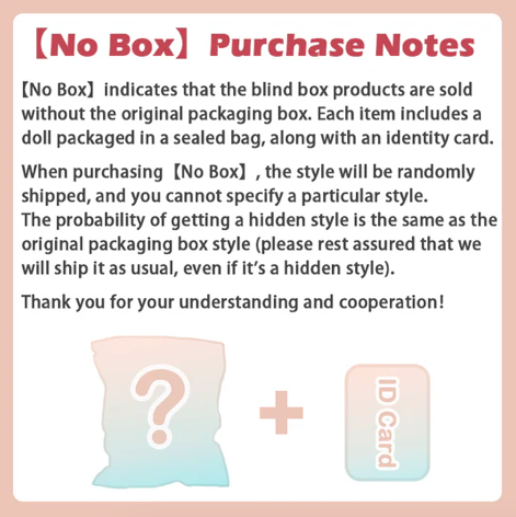 【No Box】indicates that the blind box products are sold without the original packaging box. Each item includes a doll packaged in a sealed bag, along with an identity card.