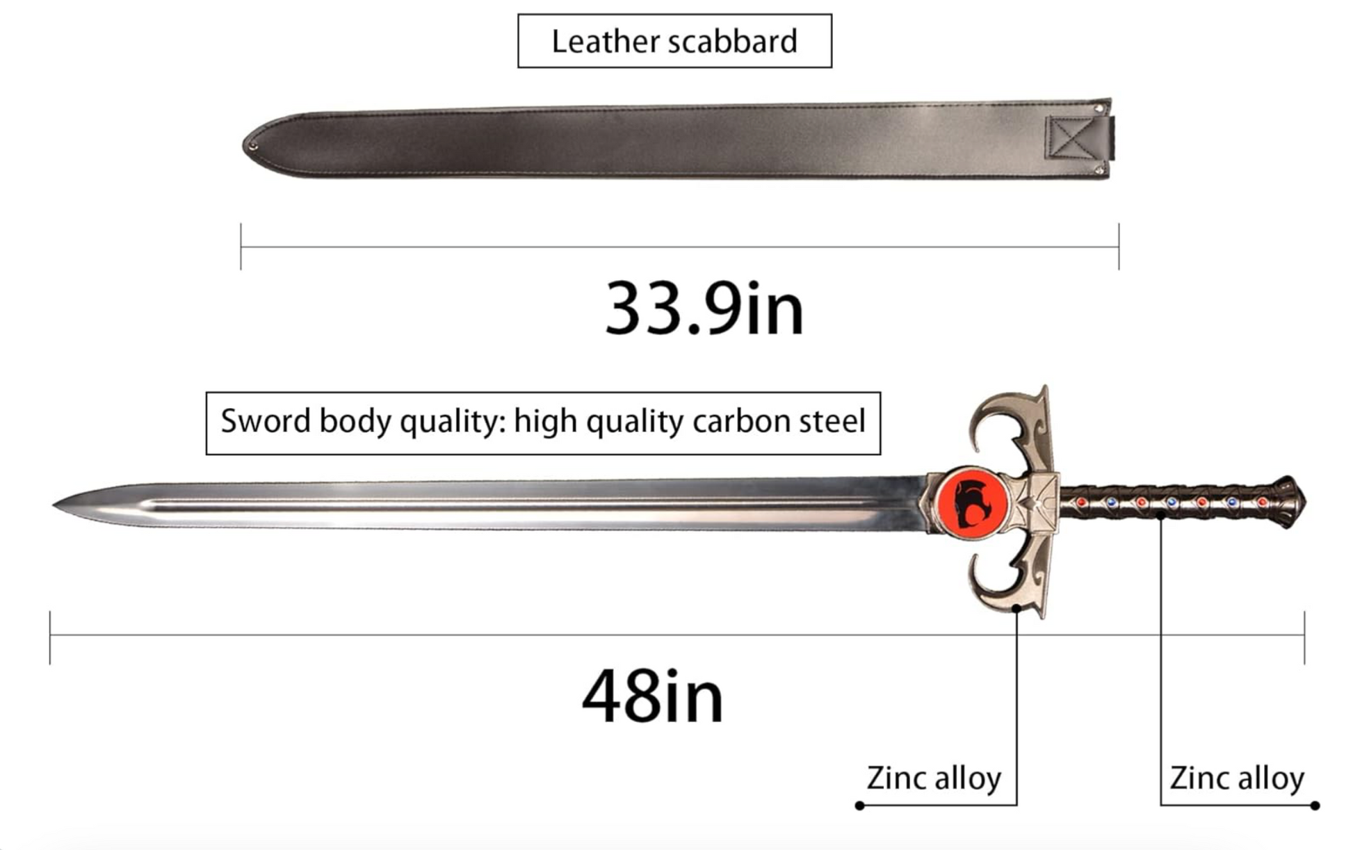 - The total length is about 48 inches, the blade length is about 32 inches, the handle is about 9.4 inches, the sheath is about 33.9 inches, and the weight is about 4 pounds.